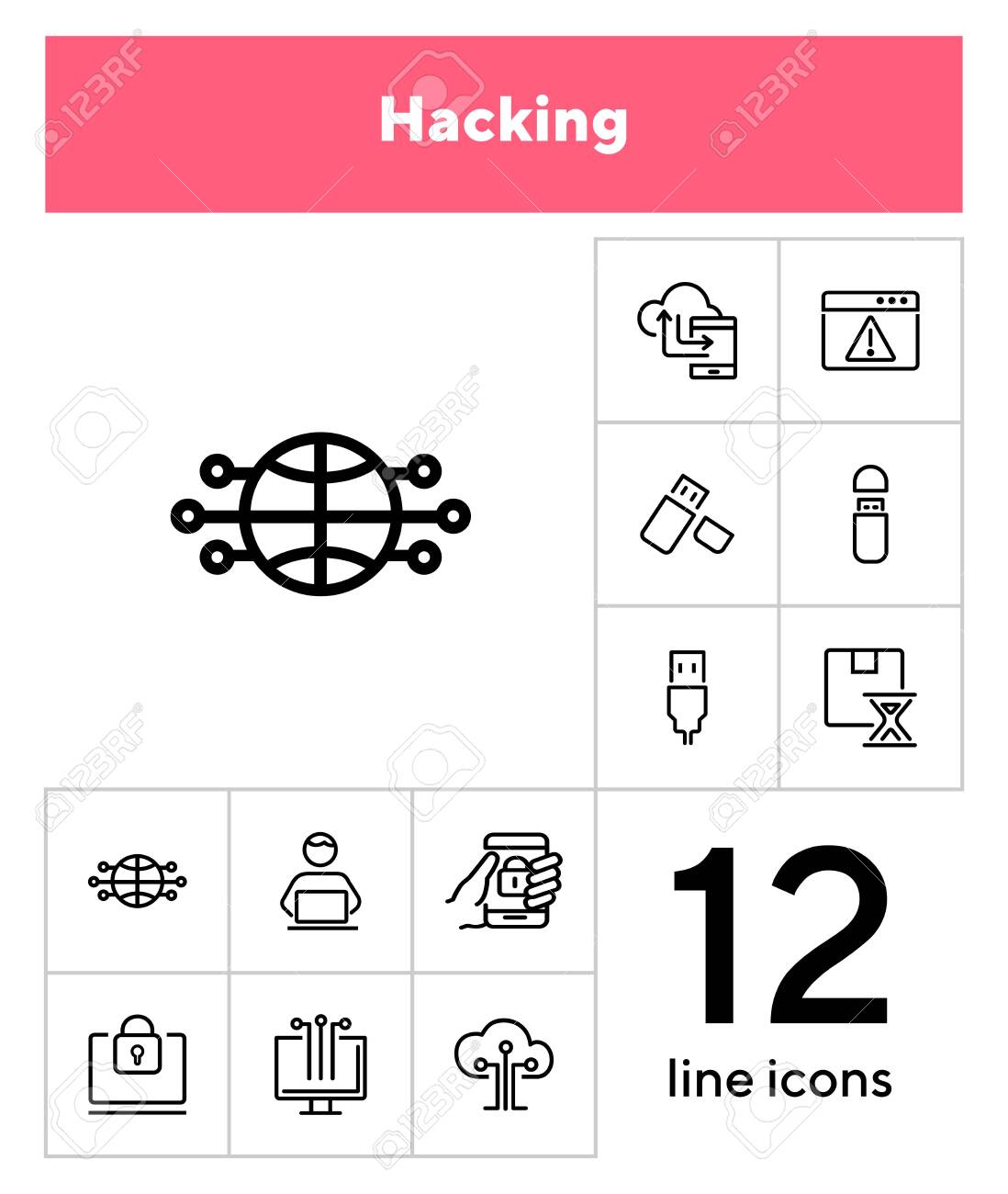 Hacking line icon set. Programmer, computer, memory stick. Information technology concept. Can be used for topics like antivirus, data safety, ...