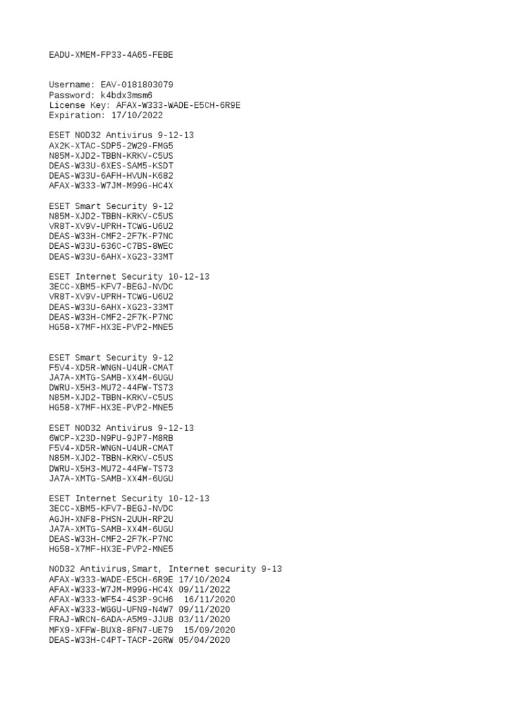 kupdf.net_eset-nod32-activation-keys-2022.pdf - license ... DX49-XKA6-XDFN-RE6H-95D6 Eset Mobile Security free license keys Username: EAV-0201228902 Password: 6urevkd5e5 key GD7F-X8JW-V8MS-MHG8-8H23 nod32 eset smart security 9, 8 Username: EAV-0180766797 Password: 2pfabvb68t