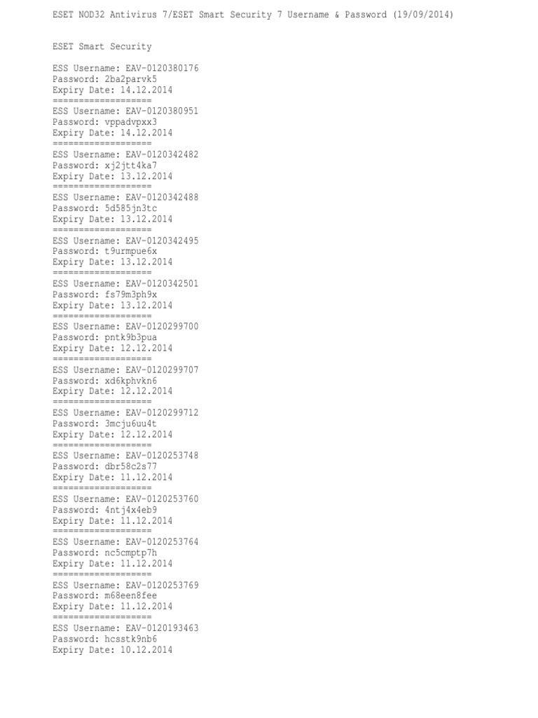 Eset antivirus username password. › int › homeCyber security with data encryption and antivirus | ESET 2. Download the ESET Smart Security Premium installer file here. 3. Double-click the installer file to begin the installation and follow the on-screen instructions. 4. Activate your protection by logging in to, or creating, your ESET HOME Account, or by inserting your unique license key. Eset Home Connect to ESET web based services and products with your ESET Account. › us › homeAntivirus for Windows and macOS devices | ESET ID.me is our trusted technology partner in helping to keep your personal information safe. Group discounts are only valid on the following products: ESET NOD32 Antivirus, ESET Internet Security, ESET Smart Security Premium, ESET Cybersecurity, and ESET Cybersecurity Pro and may not be combinable with other offers. › ca › existing-customersExisting Customers | ESET Best IT security solutions for your home and business devices. Try ESET antivirus and internet security solutions for Windows, Android, Mac or Linux OS.