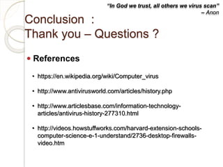 Antivirus software - Wikipedia 1949–1980 period (pre-antivirus days) Although the roots of the computer virus date back as early as 1949, when the Hungarian scientist John von Neumann published the "Theory of self-reproducing automata", the first known computer virus appeared in 1971 and was dubbed the "Creeper virus". This computer virus infected Digital Equipment Corporation's PDP-10 … What Is A Computer Virus? | Norton What are the different types of computer viruses? 1. Boot sector virus This type of virus can take control when you start — or boot — your computer. One way it can spread is by plugging an infected USB drive into your computer. 2. Web scripting virus This type of virus exploits the code of web browsers and web pages.